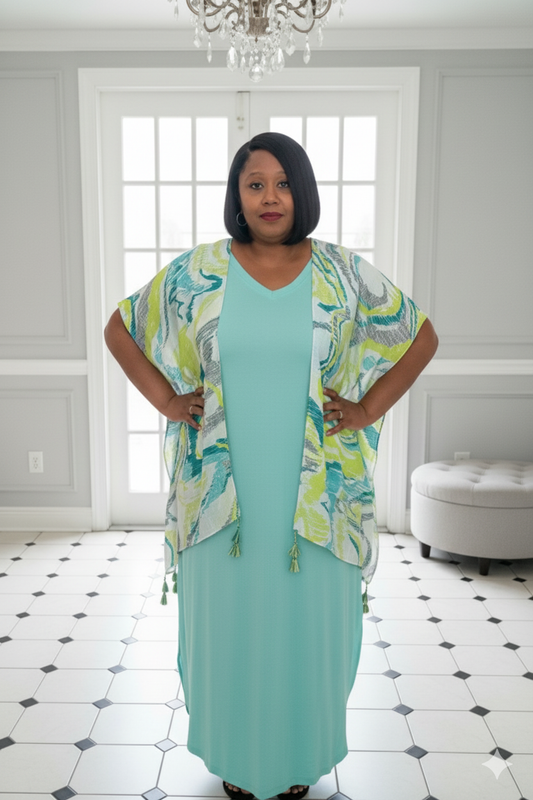 Plus Size Abstract Blue and Yellow Tassel Kimono