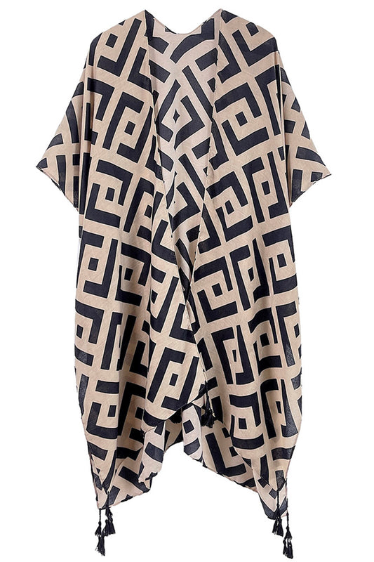 Plus Size Geometric Print Tassel Kimono Taupe