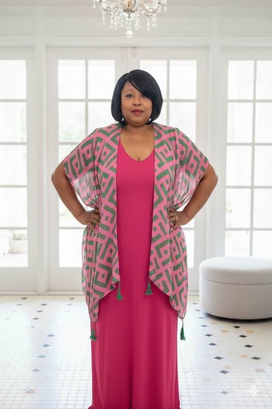 Plus Size Geometric Print Tassel Kimono Pink & Green